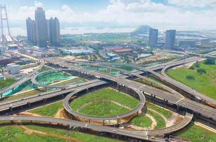 武漢市楊泗港快速通道由四新段、楊泗港長江大橋、青菱段、珞獅南路段組成,其中4.46公里的青菱段是楊泗港長江大橋武昌岸主要疏解道路,經(jīng)白沙洲大道、青菱路、黃家湖大道、李紙路,與珞獅南路相接。青菱段跨鐵路斜拉橋則是青菱段的控制性工程,主跨252米,最寬處46米,是世界上跨度最大、橋面最寬的轉(zhuǎn)體橋,設(shè)計為半漂浮體系。它上跨了武漢至黃石城際鐵路余花聯(lián)絡(luò)線、京廣鐵路等多條鐵路線,以及一座高校(武昌首義學院)。楊泗港快速通道兩側(cè)綠化帶設(shè)有雨水收集回用系統(tǒng),收集部分可收集的雨水,雨水經(jīng)處理后回用于綠化灌溉及道路沖洗。
