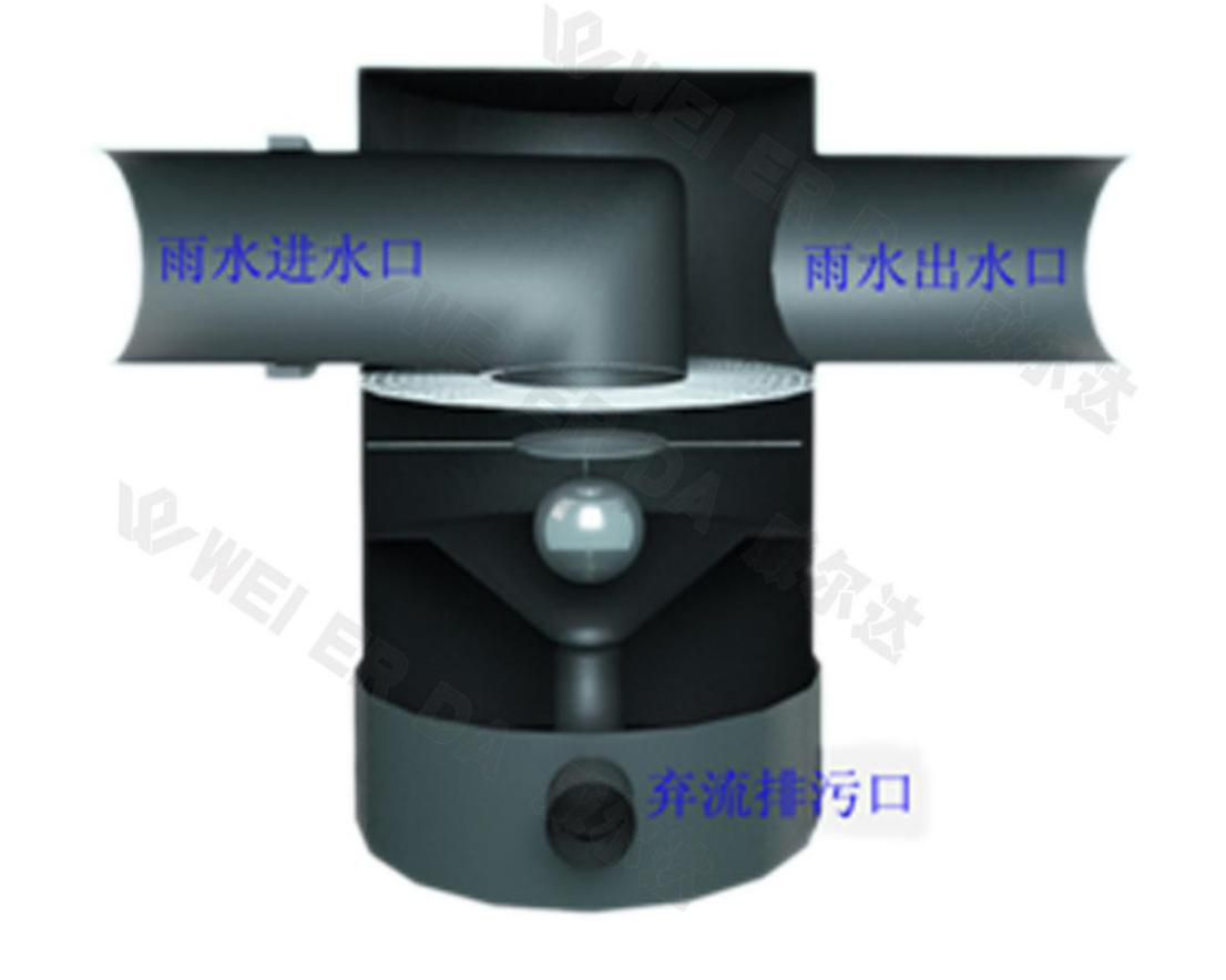 產(chǎn)品工作原理:初期降雨時(shí),前2-5mm的雨水一般污染嚴(yán)重,流量也比較小。在流經(jīng)初期棄流過(guò)濾裝置時(shí),因重力的作用,雨水將首先通過(guò)低位敞口的排污管排放掉。在雨量增大后,打在擋板上的壓力增大,位于排污管上端的浮球在水流壓力的作用下將排污管關(guān)閉,桶中液位升高,雨水通過(guò)水平的過(guò)濾網(wǎng)進(jìn)行過(guò)濾后流向出水口,進(jìn)行收集。雨停后,隨裝置中存儲(chǔ)的雨水的減少,浮球在彈簧彈力的作用下自動(dòng)復(fù)位,將桶中過(guò)濾產(chǎn)生的垃圾帶出,從而實(shí)現(xiàn)初期雨水的棄流、過(guò)濾、自動(dòng)排污等多種功能。