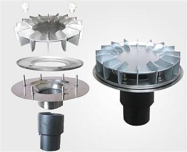 標(biāo)準(zhǔn)型的雨水斗,它是由雨水斗底座(PE材料),碟片(ASA),格柵頂蓋(PE)組成。另外根據(jù)需要可提供通用型的絕緣底座,固定件,法蘭片,焊接片,防火保護(hù)帽,微型加熱電圈等配件。雨水斗額定流量分12L/s 、25L/s、40L/s、60L/s和72L/s等,最常用的為25L/s和40L/s兩種額定流量的雨水斗。